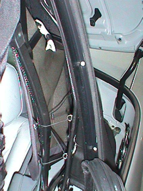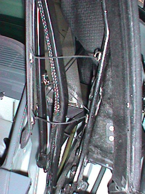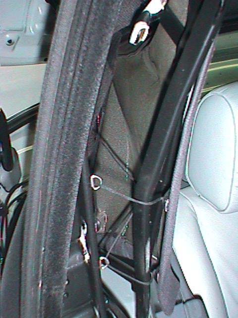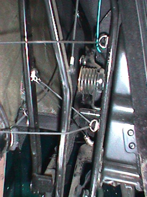 Even if your plastic side panels are fine, you may need the last headliner repair kit, the Tension Spring Repair Kit (# 336-4506). You normally need 2 kits, one for each side. Each kit includes a string, guides and screws as well as a spring. The routing of the string is critical to smooth operation. Replacement is not for the faint of heart. Photos below show strings with top in various positions.